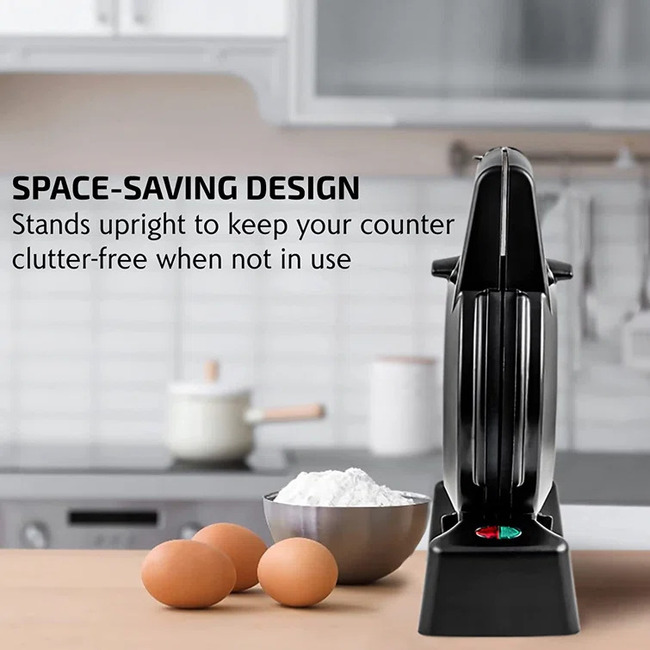 Features: This waffle iron has a 180° rotary function to ensure even cooking on top and bottom.1000 Watt heating system for efficient baking.The built-in thermostat avoids it from overheating, while the safety lock guarantees quick and convenient flipping without making a mess.Has non-slip feet to keep it in place, protecting your countertop from any spills.Has a compact size for easy storage in your cupboard or pantry, also it can stand upright.