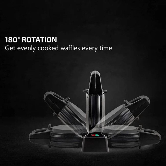 Features: This waffle iron has a 180° rotary function to ensure even cooking on top and bottom.1000 Watt heating system for efficient baking.The built-in thermostat avoids it from overheating, while the safety lock guarantees quick and convenient flipping without making a mess.Has non-slip feet to keep it in place, protecting your countertop from any spills.Has a compact size for easy storage in your cupboard or pantry, also it can stand upright.